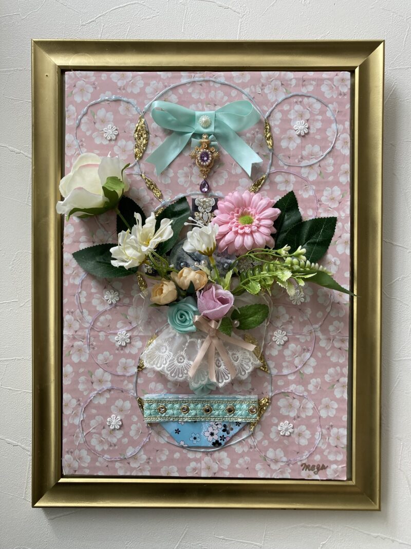 前からうちにあった額に段ボールにデザインペーパーを貼ってホットグルーでお花やリボンなどをつけました。